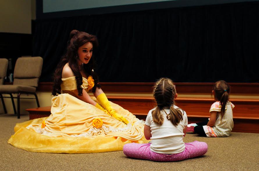 Upon entering, moms and daughters were greeted by our wonderful volunteers, along with Belle and the Beast. There were stations along the walls to make keepsake boxes and picture frames, and decorate them with glittery stickers, markers and paint. A popcorn station and Cold Stone Creamery ice cream in the back of the room featured a variety of sweet chocolate candy mix-ins. Everyone was given the princess treatment– all had the opportunity to get their hair and makeup done with the most popular hair style of the evening being a fancy topknot like Belle.