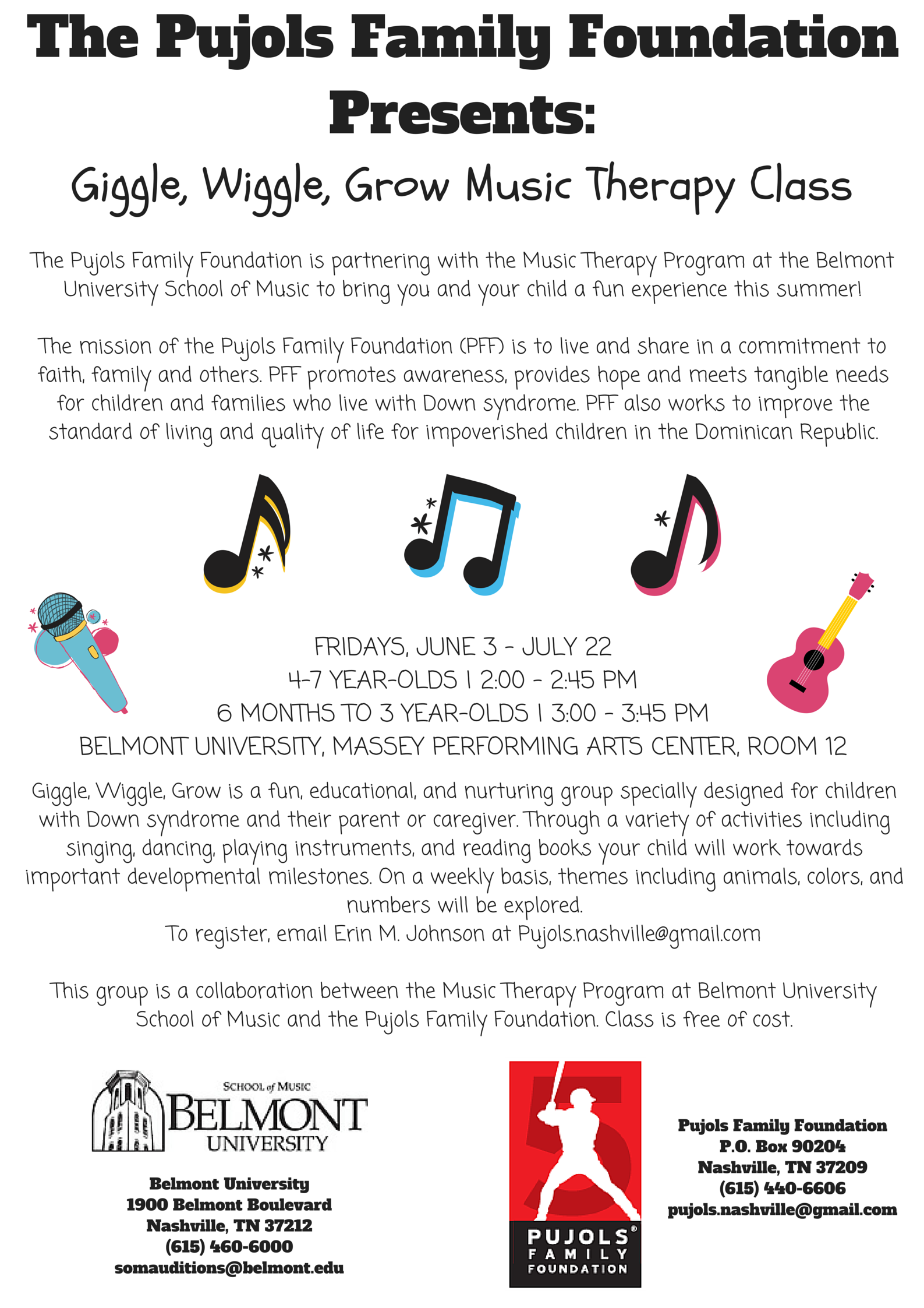 The Pujols Family Foundation is partnering with the Music Therapy Program at the Belmont University School of Music to bring you and your child a fun musical experience this summer.