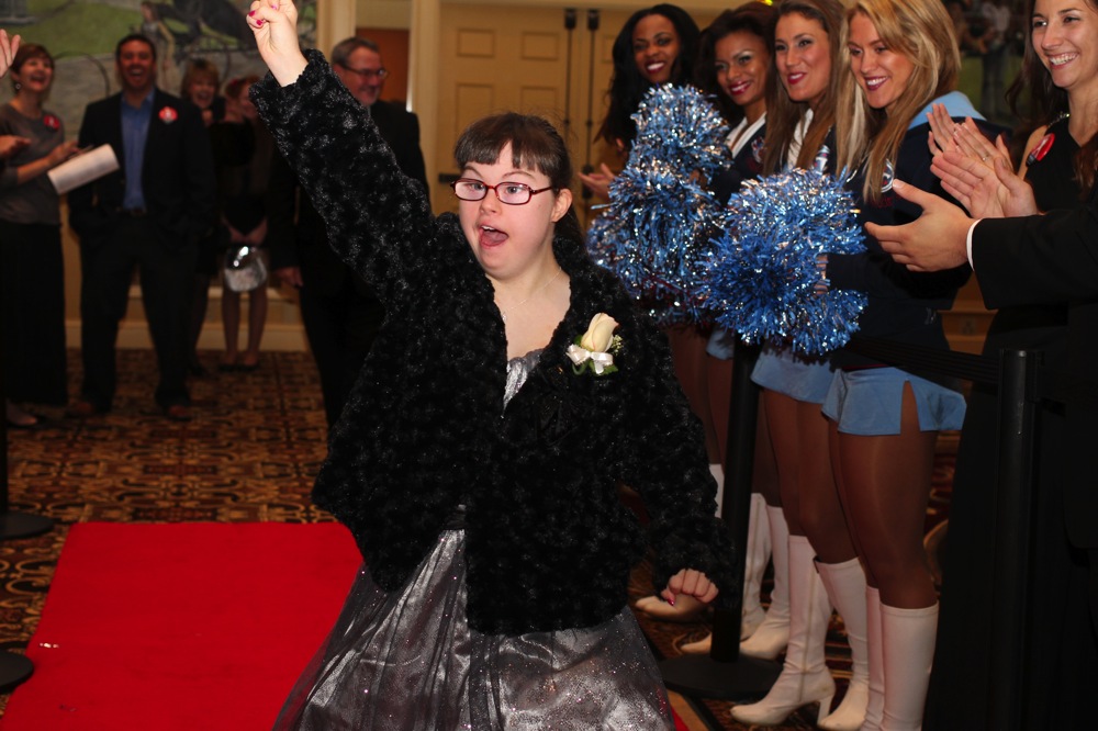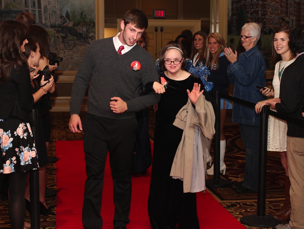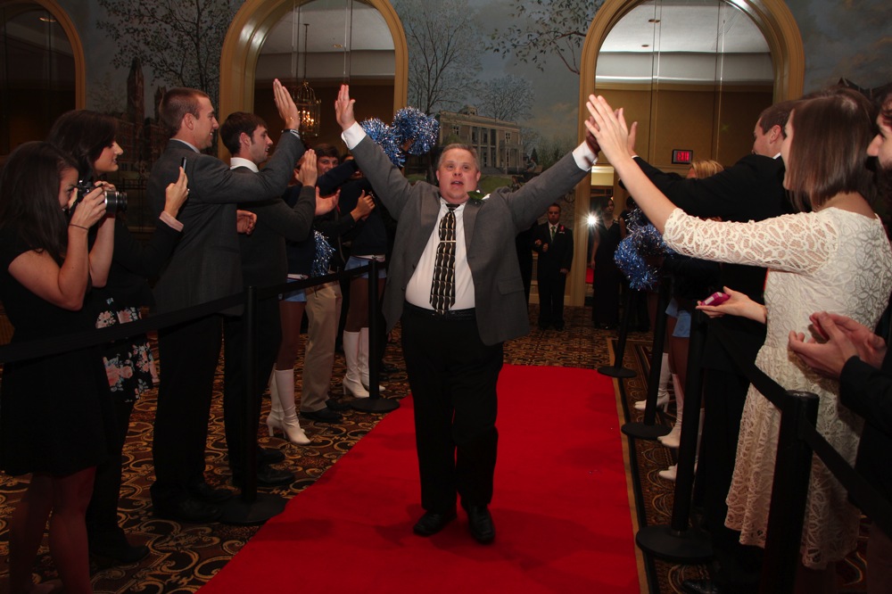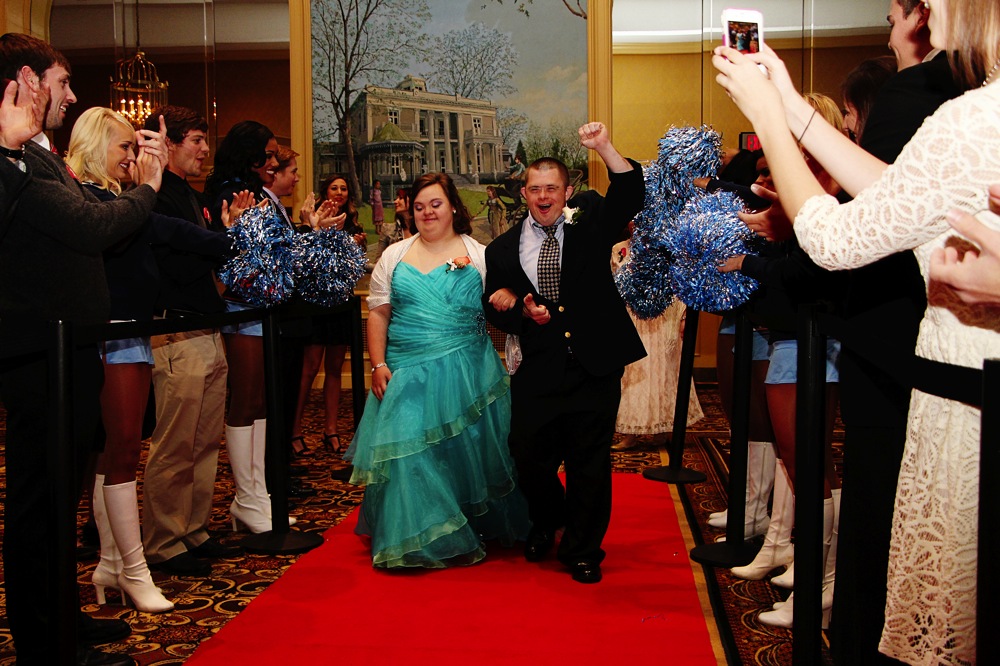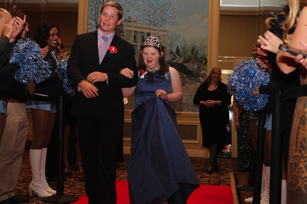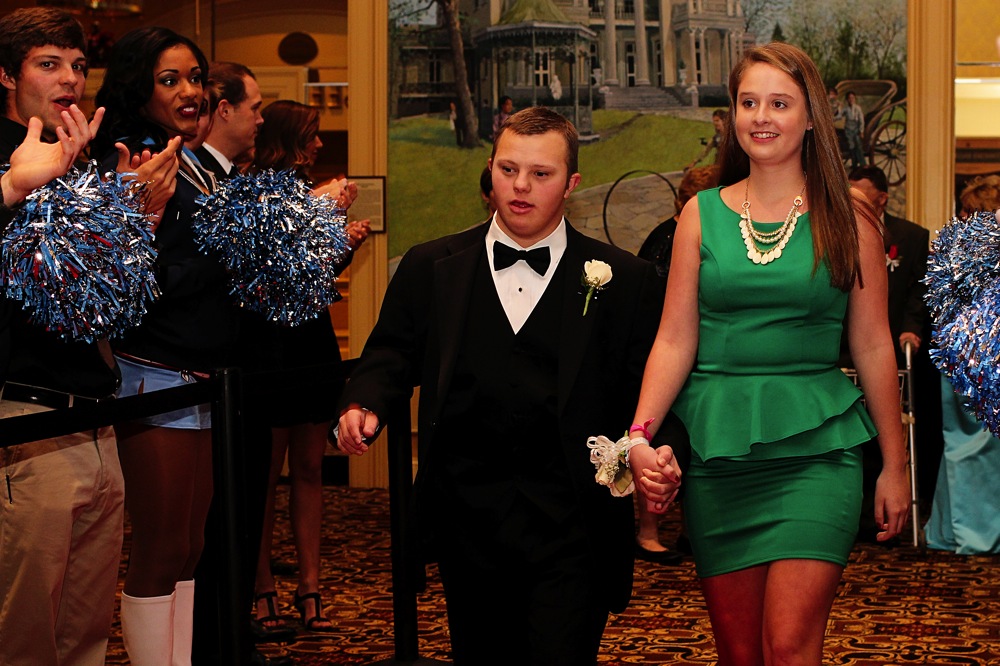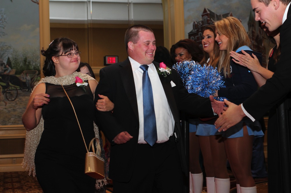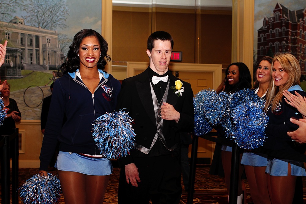 As the stars of the evening approached the ballroom, each person with Down syndrome walked down a plush red carpet surrounded by cheerful friends and volunteers from Young Life. Each couple displayed their glamour and glee as they strutted down the carpet into the ballroom with confidence. And all the single ladies and gents were thrilled to take advantage of the handsome Trevecca and Lipscomb baseball players, and the stunning Tennessee Titans cheerleaders who were available to escort guests into the prom. In addition, Bruce Matthews, NFL Hall of Famer and offensive line coach for the Tennessee Titans greeted every guest walking the red carpet and posed for many photos with our special friends.