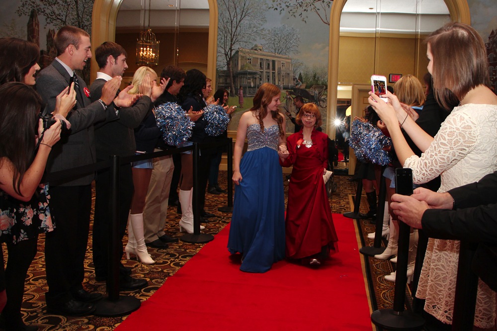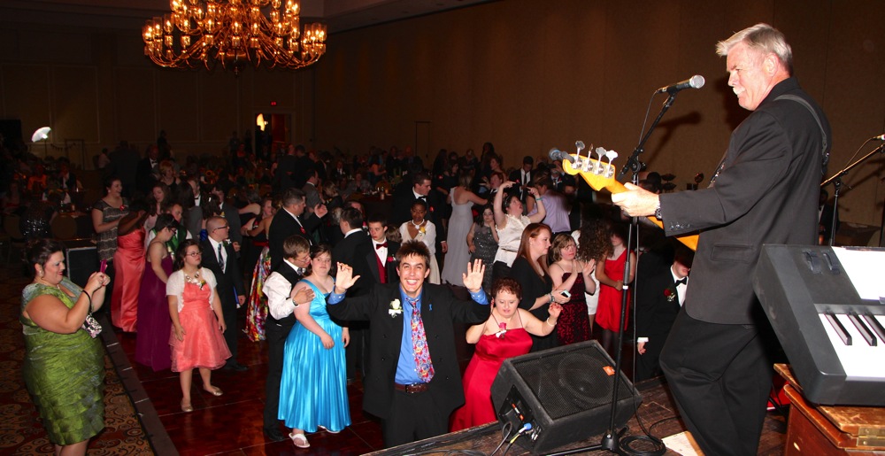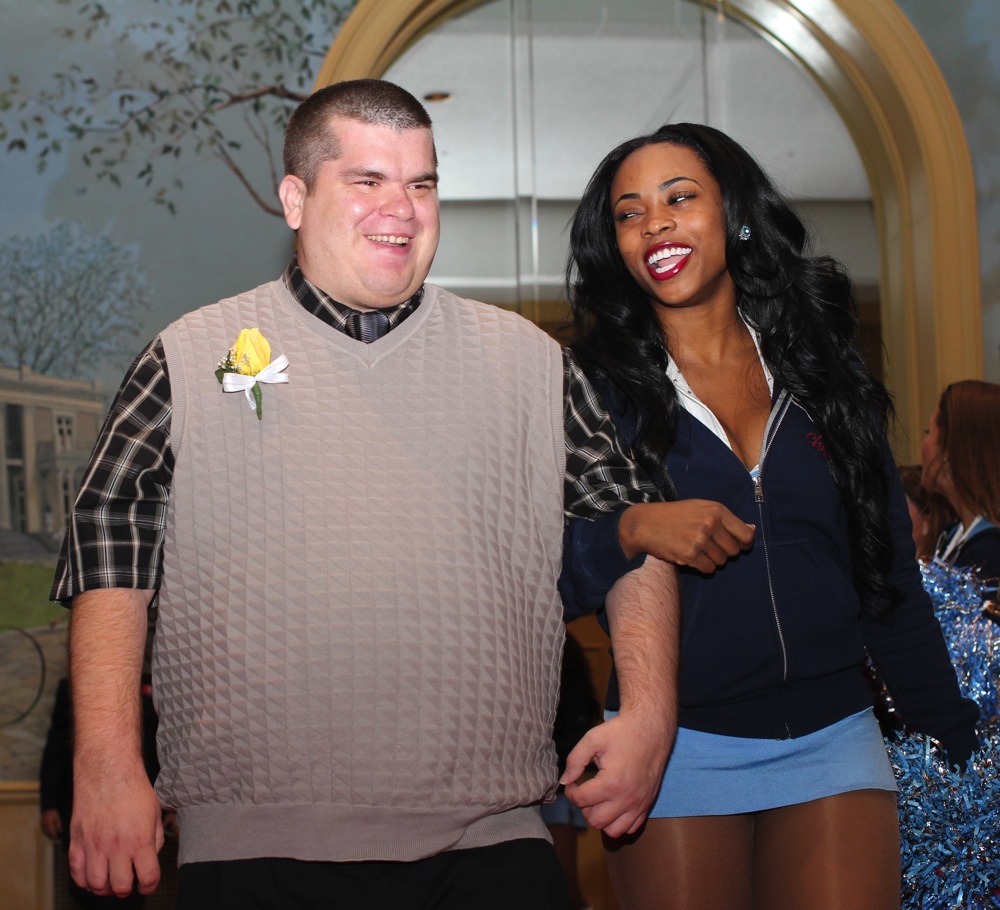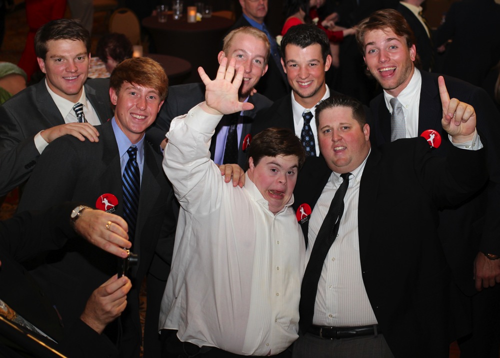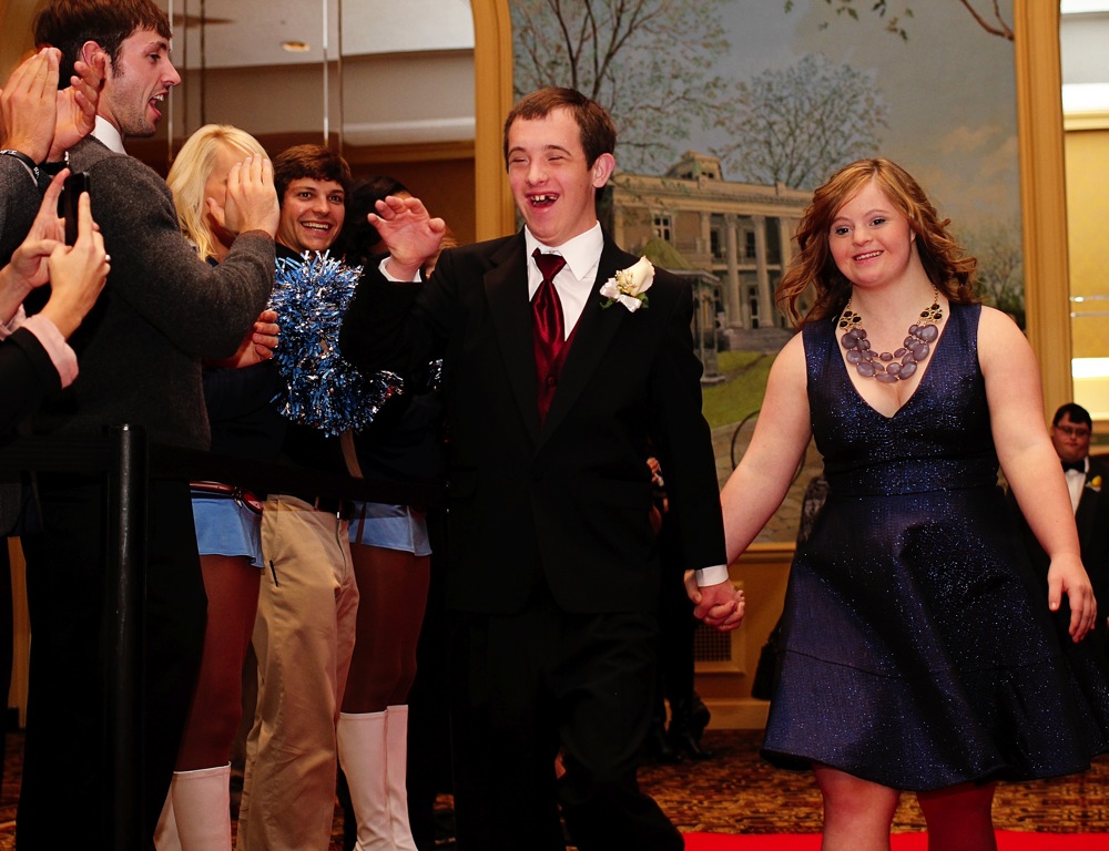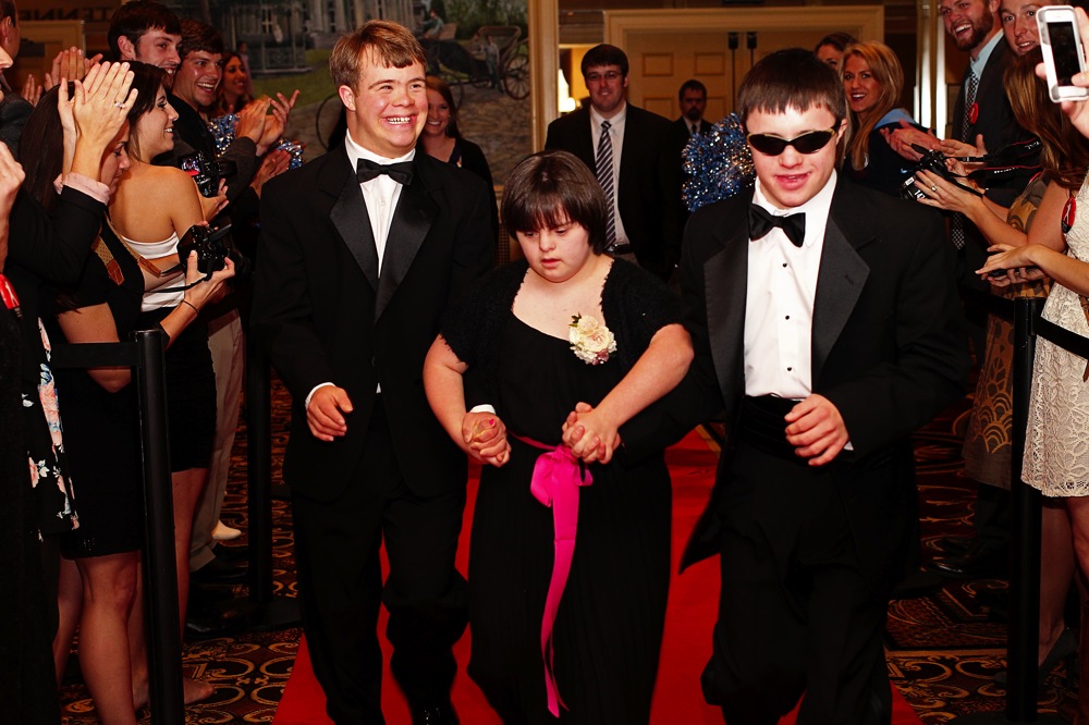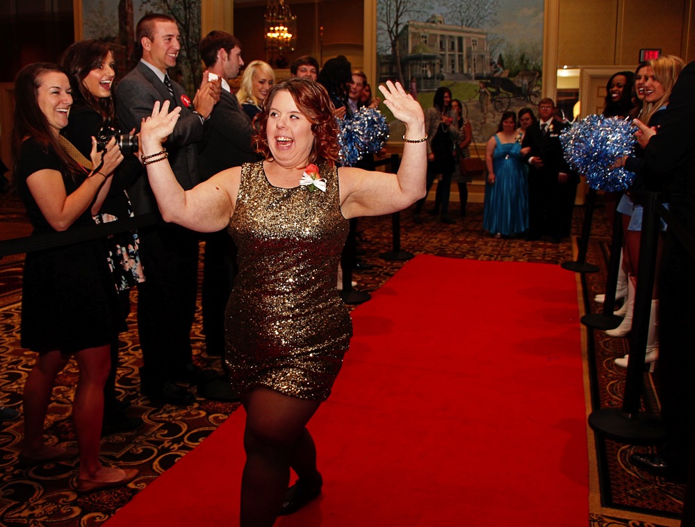 As the stars of the evening approached the ballroom, each person with Down syndrome walked down a plush red carpet surrounded by cheerful friends and volunteers from Young Life. Each couple displayed their glamour and glee as they strutted down the carpet into the ballroom with confidence. And all the single ladies and gents were thrilled to take advantage of the handsome Trevecca and Lipscomb baseball players, and the stunning Tennessee Titans cheerleaders who were available to escort guests into the prom. In addition, Bruce Matthews, NFL Hall of Famer and offensive line coach for the Tennessee Titans greeted every guest walking the red carpet and posed for many photos with our special friends.