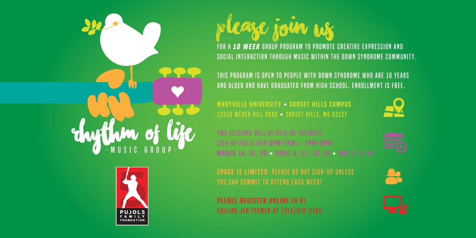 Please join us for a 10 Week group program to promote creative expression and social interaction through music within the Down syndrome community.